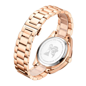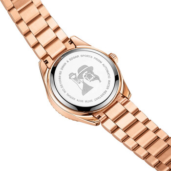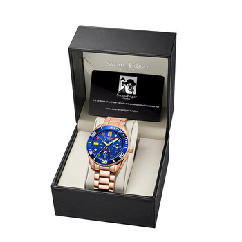 Rose gold-tone stainless steel case and bracelet. Bi-directional rotating multi-color stainless steel bezel. Blue dial with rose gold-tone hands and index hour markers. Minute markers around the outer rim. Dial Type: Analog. Luminescent hands and markers. Date display at the 3 o'clock position. 60 second subdials. Automatic movement. Scratch resistant mineral crystal. Solid case back. Round case shape, case size: 45 mm, case thickness: 15 mm. Band width: 22 mm, band length: 8.5 inches. Fold over clasp with a safety release. Water resistant at 30 meters / 100 feet. Functions: date, hour, minute, second. Sports Prism Series. Sport watch style. Swan Edgar Sports Prism Automatic Blue Dial Men's Watch SE01051.