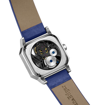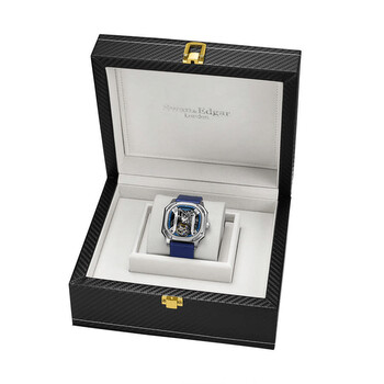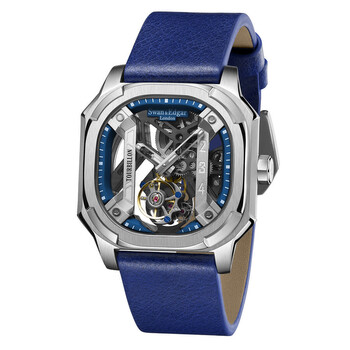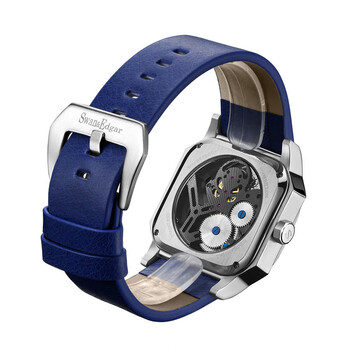 Silver-tone stainless steel case with a blue leather strap. Fixed silver-tone stainless steel bezel. Transparent dial with silver-tone hands and Arabic numeral hour markers. Minute markers around the outer rim. Dial Type: Analog. Automatic movement. Scratch resistant sapphire crystal. Transparent case back. Cushion case shape, case size: 43 mm, case thickness: 15 mm. Band width: 20 mm, band length: 7.75 inches. Buckle clasp. Water resistant at 30 meters / 100 feet. Functions: hour, minute, second. Vortex Series. Luxury watch style. Swan Edgar Vortex Automatic Men's Watch SE1793T.