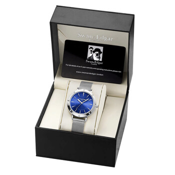 Silver-tone stainless steel case and bracelet. Fixed silver-tone stainless steel bezel. Blue dial with silver-tone hands and index hour markers. Minute scale around the inner rim. Dial Type: Analog. Luminescent hands. Quartz movement. Scratch resistant mineral crystal. Solid case back. Round case shape, case size: 38 mm, case thickness: 10.5 mm. Band width: 16 mm, band length: 7.75 inches. Fold over clasp with a safety release. Water resistant at 30 meters / 100 feet. Functions: hour, minute, second. Yacht Series. Luxury watch style. Watch label: Swiss Made. Swan Edgar Yacht Quartz Blue Dial Ladies Watch SEL021.