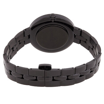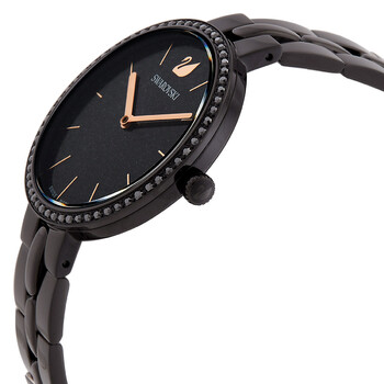 Black stainless steel case and bracelet. Black dial with rose gold-tone hands and index hour markers. Dial Type: Analog. Quartz movement. Scratch resistant mineral crystal. Pull / push crown. Round case shape, case size: 32 mm. Butterfly with push buttons clasp. Water resistant at 50 meters / 165 feet. Functions: hour, minute. Swarovski Cosmopolitan Quartz Black Dial Watch 5547646.