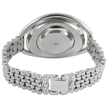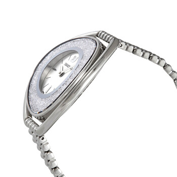Stainless steel case with a stainless steel bracelet. Fixed stainless steel bezel with a Swarovski crystal-set ring. Silver dial with silver-tone hands and index hour markers. The Swarovski Swan appears at the 12 o'clock position. Dial Type: Analog. Quartz movement. Scratch resistant mineral crystal. Pull / push crown. Solid case back. Oval case shape. Case dimensions: 37 mm x 43 mm. Case thickness: 10 mm. Band width: 12 mm. Water resistant at 30 meters / 100 feet. Functions: hour, minute. Additional Info: circular inner ring filled with approximately 1700 clear crystals. Dress watch style. Watch label: Swiss Made. Swarovski Crystaline Oval Quartz Silver Dial Ladies Watch 5181008.