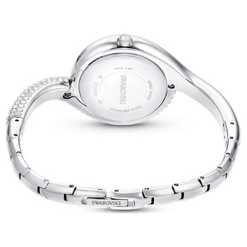 Silver-tone stainless steel case and bracelet. Fixed silver-tone bezel with crystal set. White dial with silver-tone hands and crystal hour markers. Dial Type: Analog. Quartz movement. Pull / push crown. Solid case back. Round case shape, case size: 1 1/8 x 1 1/8 inch. Fold over clasp with a safety release. Water resistant at 50 meters / 165 feet. Functions: hour, minute. Dextera Asymmetric Series. Dress watch style. Watch label: Swiss Made. Swarovski Dextera Asymmetric Watch.