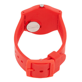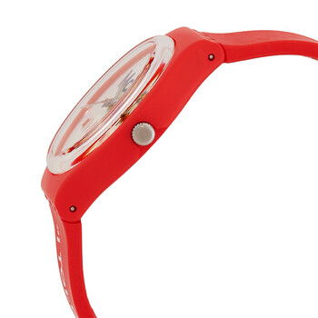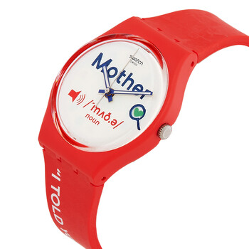 Red plastic case with a red silicone strap. Fixed red plastic bezel. White dial with black hands. No markers. Dial Type: Analog. Luminescent hands. Quartz movement. Pull / push crown. Solid case back. Round case shape, case size: 34 mm, case thickness: 8.75 mm. Band width: 16 mm. Buckle clasp. Water resistant at 30 meters / 100 feet. Functions: hour, minute, second. All About Mom Series. Casual watch style. Watch label: Swiss Made. Swatch All About Mom Quartz White Dial Unisex Watch GZ713.