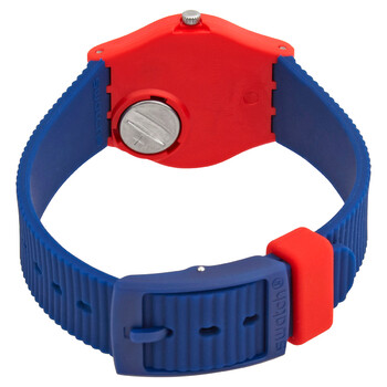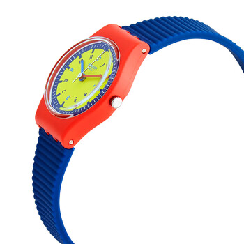 Red plastic case with a blue silicone strap. Fixed red plastic bezel. Yellow dial with light blue and red hands and Arabic numeral / index hour markers. Minute markers around the outer rim. Dial Type: Analog. Quartz movement. Scratch resistant plexiglass crystal. Pull / push crown. Solid case back. Round case shape, case size: 25 mm, case thickness: 7 mm. Band width: 16 mm. Tang clasp. Water resistant at 30 meters / 100 feet. Functions: hour, minute, second. Bambino Series. Casual watch style. Watch label: Swiss Made. Swatch Bambino Quartz Watch LR131.