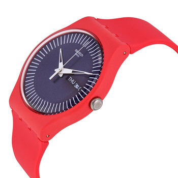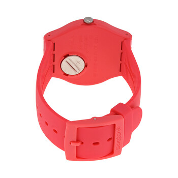 Pink plastic case with a pink silicone strap. Fixed pink plastic bezel. Black dial with white hands and index hour markers. Dial Type: Analog. Day of the week and date display at the 3 o'clock position. Quartz movement. Scratch resistant mineral crystal. Pull / push crown. Solid case back. Case diameter: 41 mm. Case thickness: 10 mm. Round case shape. Band width: 20 mm. Tang clasp. Water resistant at 30 meters / 100 feet. Functions: date, day, hour, minute, second. Sport watch style. Watch label: Swiss Made. Swatch Berry Rail Black Dial Unisex Watch SUOP702.