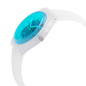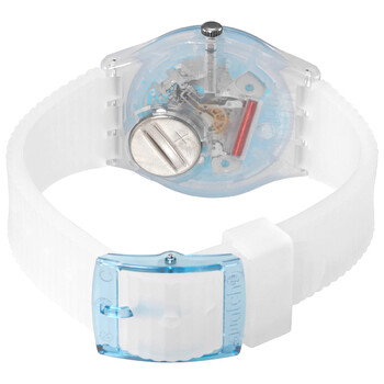 Translucent plastic case with a transparent silicone strap. Fixed translucent plastic bezel. Brilliant blue "pool" effect dial with white hands and Arabic numeral hour markers. Dial Type: Analog. Quartz movement. Plexiglass crystal. Pull / push crown. Translucent case back. Round case shape. Case size: 34 mm. Case thickness: 8.75 mm. Band width: 16 mm. Tang clasp. Water resistant at 30 meters / 100 feet. Functions: hour, minute, second. Bianco Series. Casual watch style. Swatch BIANCO Quartz Brilliant Blue Dial Men's Watch GW215.