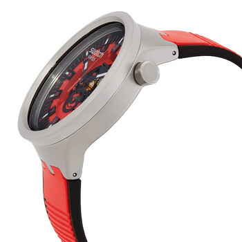 Silver-tone stainless steel case with a red rubber strap. Fixed silver-tone stainless steel bezel. Black and red dial with black hands and index-Arabic numeral hour markers. Minute markers around the outer rim. Dial Type: Analog. Luminescent hands and markers. Quartz movement. Scratch resistant acrylic crystal. Solid case back. Round case shape, case size: 47 mm, case thickness: 13.3 mm. Buckle clasp. Water resistant at 30 meters / 100 feet. Functions: hour, minute, second. Big Bold Irony Series. Casual watch style. Watch label: Swiss Made. Swatch Big Bold Irony Quartz Unisex Watch SB07S110.