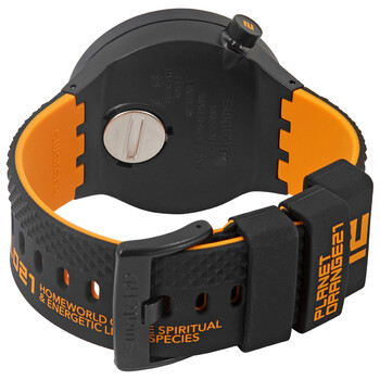 Black plastic case with a black (orange backed) silicone strap. Fixed black plastic bezel with a black ring. Transparent orange dial with black hands and Arabic numeral hour markers. Dial Type: Analog. Quartz movement. Plexiglass crystal. Pull / push crown. Solid case back. Round case shape. Case size: 47 mm. Case thickness: 11.75 mm. Tang clasp. Water resistant at 30 meters / 100 feet. Functions: hour, minute, second. Big Bold Planets Series. Casual watch style. Watch label: Swiss Made. Swatch Big Bold Planets Quartz Men's Watch SB01B127.