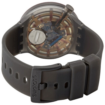 Black plastic case with a black silicone strap. Fixed black plastic bezel with a hot pink ring. Blue (transparent) dial with hot pink hands and index hour markers. Minute markers around the outer rim. Dial Type: Analog. Quartz movement. Scratch resistant plexiglass crystal. Pull / push crown. Transparent case back. Round case shape. Case size: 47 mm. Case thickness: 11.75 mm. Tang clasp. Water resistant at 30 meters / 100 feet. Functions: hour, minute, second. Big Bold Series. Casual watch style. Swatch Big Bold Quartz Blue Dial Unisex Watch SO27B111.