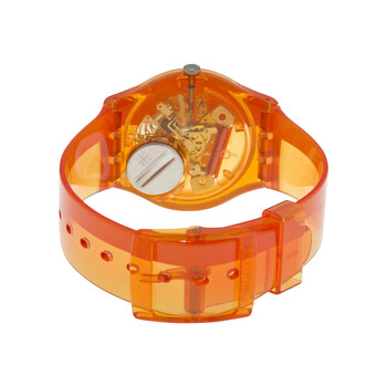 Orange plastic case with a orange plastic strap. Fixed translucent orange bezel. Orange skeleton dial with white hands. No markers. Dial Type: Analog. Quartz movement. Scratch resistant mineral crystal. Pull / push crown. Transparent case back. Case dimensions: 34 mm x 39.20 mm. Case thickness: 8.75 mm. Round case shape. Band width: 20 mm. Band length: 7 inches. Tang clasp. Water resistant at 30 meters / 100 feet. Functions: hour, minute, second. Casual watch style. Watch label: Swiss Made. Swatch Bloody Orange Skeleton Dial Orange Plastic Unisex Watch GO116.