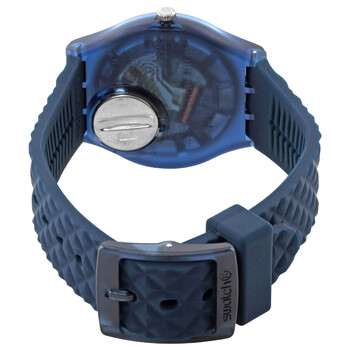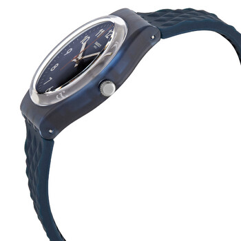Blue plastic case with a blue silicone strap. Fixed blue plastic bezel. Blue dial with silver-tone hands and Arabic numeral hour markers. Minute markers around the outer rim. Dial Type: Analog. Quartz movement. Plexiglass crystal. Pull / push crown. Translucent case back. Round case shape. Case size: 34 mm. Case thickness: 8.75 mm. Band width: 21 mm. Tang clasp. Water resistant at 30 meters / 100 feet. Functions: hour, minute, second. Bluenel Series. Casual watch style. Swatch Bluenel Quartz Blue Dial Unisex Watch GN271.