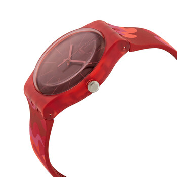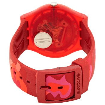Red plastic case with a red silicone strap. Fixed red plastic bezel. Red dial with pink hands and index hour markers. Dial Type: Analog. Quartz movement. Scratch resistant plexiglass crystal. Pull / push crown. Transparent case back. Round case shape, case size: 41 mm, case thickness: 9.85 mm. Buckle clasp. Water resistant at 30 meters / 100 feet. Functions: hour, minute, second. Camouflash Series. Casual watch style. Swatch Camouflash Quartz Red Dial Unisex Watch SUOR116.