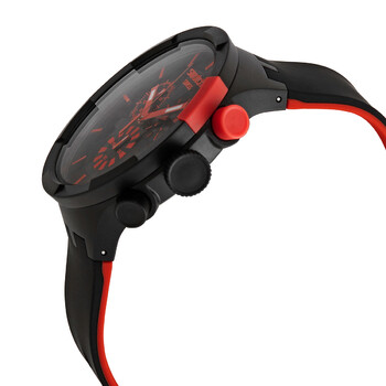 Black plastic case with a black (red back) silicone strap. Fixed black plastic bezel. Black dial with luminous red hands and index hour markers. Dial Type: Analog. Luminescent hands. Date display at the 4 o'clock position. Chronograph - three sub-dials displaying: 60 second, 60 minute and 1/10th of a second. Quartz movement. Scratch resistant plexiglass crystal. Pull / push crown. Solid case back. Round case shape. Case size: 47 mm. Case thickness: 14 mm. Band width: 20 mm. Tang clasp. Water resistant at 30 meters / 100 feet. Functions: chronograph, date, hour, minute, second. Checkpoint Black Series. Casual watch style. Swatch Checkpoint Red Chronograph Quartz Unisex Watch SB02B402.