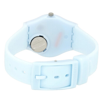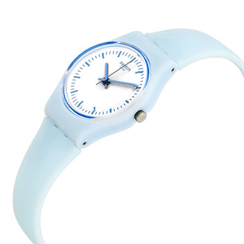 Blue plastic case with a blue rubber strap. Fixed blue plastic bezel. White dial dial with blue hands and index hour markers. Minute markers around the outer rim. Dial Type: Analog. Quartz movement. Scratch resistant mineral crystal. Pull / push crown. Solid case back. Case size: 25 mm. Case thickness: 7 mm. Round case shape. Band width: 20 mm. Tang clasp. Water resistant at 30 meters / 100 feet. Functions: hour, minute, second. Casual watch style. Swatch Clearsky White Dial Ladies Watch LL119.