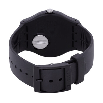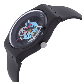 Black bio-sourced material case and band. Fixed black bio-sourced material bezel. Black ( skeleton) dial with black hands. No markers. Dial Type: Analog. Quartz movement. Scratch resistant plexiglass crystal. Pull / push crown. Solid case back. Round case shape, case size: 41 mm, case thickness: 9.85 mm. Buckle clasp. Water resistant at 30 meters / 100 feet. Functions: hour, minute, second. Additional Info: movement elements with colors that have been randomly preselected. Core Black Lacquered Series. Casual watch style. Swatch Core Black Lacquered Quartz Black Dial Men's Watch SO29B107.