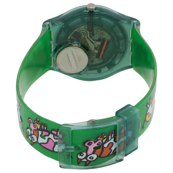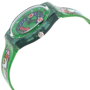 Green plastic case with a green plastic folio strap. Fixed green plastic bezel. Green dial with black hands and Arabic numeral hour markers. Minute markers around the inner ring. Dial Type: Analog. Quartz movement. Pull / push crown. Solid case back. Round case shape, case size: 34 mm, case thickness: 8.75 mm. Buckle clasp. Water resistant at 30 meters / 100 feet. Functions: hour, minute. Crazy Train Series. Casual watch style. Swatch Crazy Train Quartz Green Dial Unisex Watch GG194.