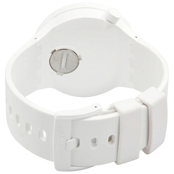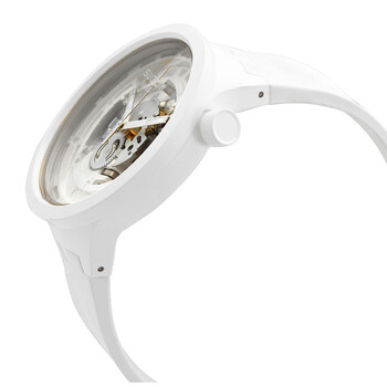 White bio-ceramic case with a white bio-sourced band. Fixed white bio-ceramic bezel. Skeleton dial with luminous hands. No markers. Dial Type: Analog. Quartz movement. Plexiglass crystal. Pull / push crown. Solid case back. Round case shape. Case size: 47 mm. Case thickness: 11.75 mm. Tang clasp. Water resistant at 30 meters / 100 feet. Functions: hour, minute, second. C-white Series. Casual watch style. Watch label: Swiss Made. Swatch C-White Quartz Skeleton Dial Men's Watch SB03W100.
