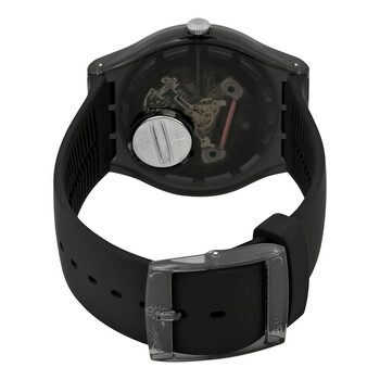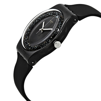 Black plastic case with a black silicone strap. Fixed translucent plastic bezel. Black (set with black stone) dial with silver-tone hands. No markers. Dial Type: Analog. Quartz movement. Plexiglass crystal. Pull / push crown. Solid case back. Round case shape. Case size: 41 mm. Case thickness: 9.85 mm. Band width: 19 mm. Tang clasp. Water resistant at 30 meters / 100 feet. Functions: hour, minute, second. Dress watch style. Swatch Darksparkles Black Dial Black Silicone Ladies Watch SUOB156