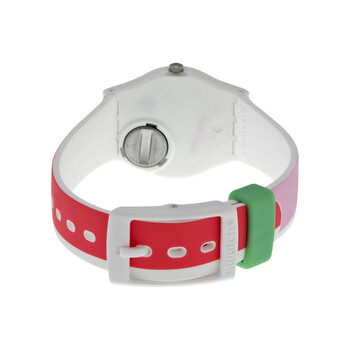 White plastic case with a white, red and pink silicone strap. Fixed translucent plastic bezel. Aqua-blue dial with white and orange hands and Arabic numeral hour markers. Dial Type: Analog. Quartz movement. Plastic crystal. Pull / push crown. Solid case back. Round case shape. Case dimensions: 31 mm x 24.4 mm. Case thickness: 7 mm. Band width: 12 mm. Tang clasp. Water resistant at 30 meters / 100 feet. Functions: hour, minute, second. Casual watch style. Watch label: Swiss Made. Swatch De Travers Blue Dial Ladies Watch LW146.