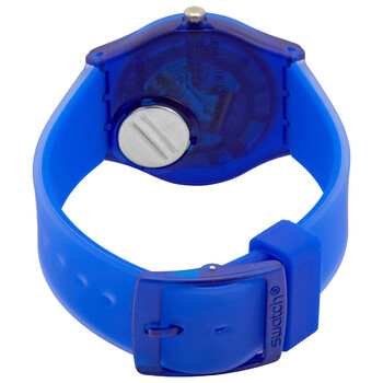 Blue (translucent) plastic case with a blue (translucent) silicone strap. Fixed blue (translucent) plastic bezel. White dial with blue hands and index hour markers. Arabic numerals appear at the 3, 6, 9 and 12 o'clock positions. Dial Type: Analog. Quartz movement. Plexiglass crystal. Pull / push crown. Translucent case back. Round case shape. Case size: 34 mm. Case thickness: 8.75 mm. Band width: 16.5 mm. Tang clasp. Water resistant at 30 meters / 100 feet. Functions: hour, minute, second. Electric Shark Series. Casual watch style. Watch label: Swiss Made. Swatch Electric Shark Quartz White Dial Unisex Watch GN268.
