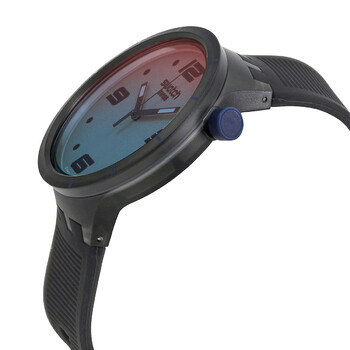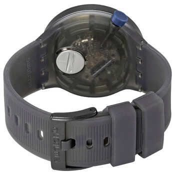 Black plastic case with a black silicone strap. Fixed black plastic bezel. Grey (solar spectrum effect) dial with luminous blue hands and dot hour markers. Arabic numerals apperar at the 3, 6, 9 and 12 o'clock positions. Dial Type: Analog. Luminescent hands. Quartz movement. Plexiglass crystal. Pull / push crown. Translucent case back. Round case shape. Case size: 47 mm. Case thickness: 11.75 mm. Strap width: 24 mm. Tang clasp. Water resistant at 30 meters / 100 feet. Functions: hour, minute, second. Futuristic Grey Series. Casual watch style. Swatch Futuristic Grey Quartz Men's Watch SO27B121.
