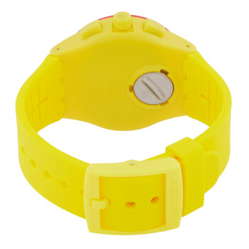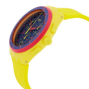 Yellow plastic case with a yellow silicone strap. Fixed bezel. Blue dial with pink hands and index hour markers. Minute markers around the outer rim. Dial Type: Analog. Date display at the 6 o'clock position. Chronograph - three sub-dials displaying: 60 second, 60 minute and 1/10th of a second. Quartz movement. Scratch resistant plexiglass crystal. Pull / push crown. Solid case back. Round case shape, case size: 42 mm, case thickness: 14.03 mm. Buckle clasp. Water resistant at 30 meters / 100 feet. Functions: chronograph, date, hour, minute, second. Glow Loom Series. Casual watch style. Swatch Glow Loom Chronograph Quartz Blue Dial Men's Watch SUSJ400.