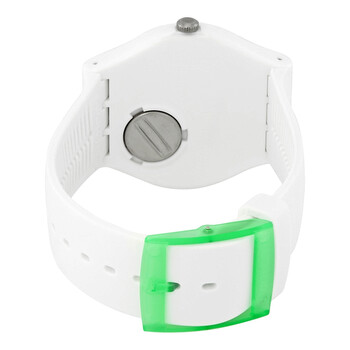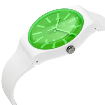 White plastic case with a white silicone strap. Fixed white plastic bezel. Green dial with white hands and index hour markers. Dial Type: Analog. Quartz movement. Plexiglass crystal. Pull / push crown. Solid case back. Round case shape. Case size: 41 mm. Case thickness: 9.85 mm. Tang clasp. Water resistant at 30 meters / 100 feet. Functions: hour, minute, second. Casual watch style. Swatch Grassneon Green Dial Unisex Watch SUOW166.
