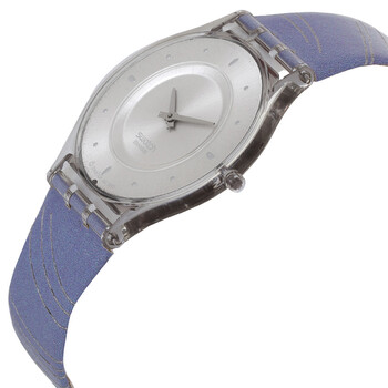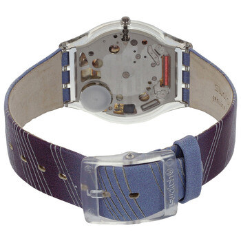 Transparent plastic case with a purple leather strap. Fixed transparent plastic bezel. Silver dial with silver-tone hands and index hour markers. Dial Type: Analog. Quartz movement. Scratch resistant acrylic crystal. Pull / push crown. Round case shape, case size: 34 mm. Buckle clasp. Water resistant at 30 meters / 100 feet. Functions: hour, minute. Hits And Hots Series. Casual watch style. Watch label: Swiss Made. Swatch Hits And Hots Quartz Silver Dial Watch SFK246-30.