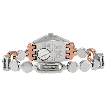 Stainless steel case with a two-tone stainless steel bangle bracelet with crystal inserts. Fixed pink gold-tone bezel. Silver dial with silver-tone hands and dot hour markers. Arabic numerals mark the 3, 6, 9 and 12 o'clock positions. Dial Type: Analog. Quartz movement. Scratch resistant mineral crystal. Pull / push crown. Solid case back. Case diameter: 25 mm. Case thickness: 8.5 mm. Round case shape. Band width: 10 mm. Jewelry clasp. Water resistant at 30 meters / 100 feet. Functions: hour, minute, second. Dress watch style. Swatch Irony Lady Passion Silver Dial Two-Tone Ladies Watch YSS234G.