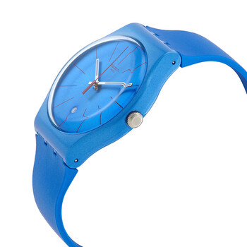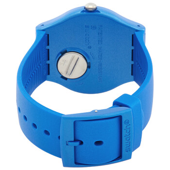 Blue plastic case with a blue silicone strap. Fixed blue plastic bezel. Blue dial with white hands and index hour markers. Minute markers around the outer rim. Dial Type: Analog. Luminescent hands. Quartz movement. Scratch resistant plexiglass crystal. Pull / push crown. Solid case back. Round case shape. Case dimensions: 41 mm x 47 mm. Case thickness: 9.85 mm. Band width: 19.7 mm. Tang clasp. Water resistant at 30 meters / 100 feet. Functions: hour, minute, second. Lagoonazing Series. Casual watch style. Swatch Lagoonazing Quartz Blue Dial Unisex Watch SUOS401.