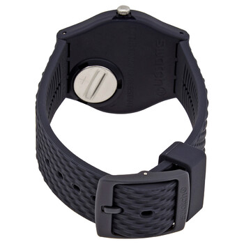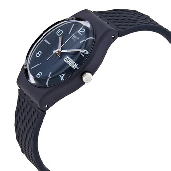 Blue plastic case with a blue silicone strap. Fixed blue plastic bezel. Dark blue dial with grey hands and alternating index and Arabic numeral hour markers. Dial Type: Analog. Day of the week and date display at the 3 o'clock position. Quartz movement. Plexiglass crystal. Pull / push crown. Solid case back. Round case shape. Case size: 34 mm. Case thickness: 9 mm. Band width: 17 mm. Tang clasp. Water resistant at 30 meters / 100 feet. Functions: hour, minute, second. Laserata Series. Casual watch style. Watch label: Swiss Made. Swatch Laserata Quartz Dark Blue Dial Unisex Watch GN725.