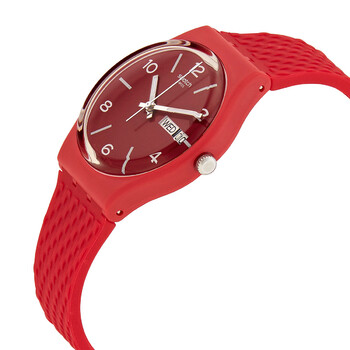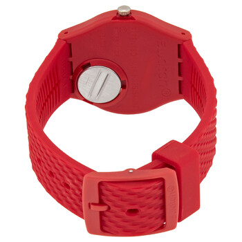 Red plastic case with a red silicone strap. Fixed red plastic bezel. Red dial with luminous silver-tone hands and alternating Arabic numeral and index hour markers. Dial Type: Analog. Luminescent hands. Day of the week and date display at the 3 o'clock position. Quartz movement. Plexiglass crystal. Pull / push crown. Solid case back. Round case shape. Case size: 34 mm. Case thickness: 8.75 mm. Band width: 17 mm. Tang clasp. Water resistant at 30 meters / 100 feet. Functions: hour, minute, second. Lazered Series. Casual watch style. Watch label: Swiss Made. Swatch Lazered Quartz Red Dial Unisex Watch GR710.