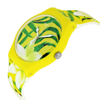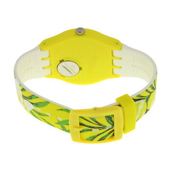 Yellow plastic case with a yellow patterned silicone strap. Fixed yellow plastic bezel. Yellow patterned dial with luminous hands. No markers. Dial Type: Analog. Quartz movement. Plexiglass crystal. Pull / push crown. Solid case back. Round case shape. Case size: 41 mm. Case thickness: 10 mm. Band width: 18 mm. Tang clasp. Water resistant at 30 meters / 100 feet. Functions: hour, minute, second. Limbo Dance Series. Casual watch style. Swatch Limbo Dance Yellow Patterned Dial Yellow Patterned Silicone Unisex Watch SUOJ104.
