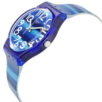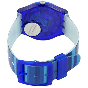 Blue plastic case with a blue (multi-shade) plastic strap. Fixed translucent plastic bezel. Blue (multi-shade) dial with white hands and Arabic numeral hour markers. Dial Type: Analog. Quartz movement. Plastic crystal. Pull / push crown. Translucent case back. Case diameter: 34 mm. Case thickness: 8 mm. Round case shape. Band width: 20 mm. Tang clasp. Water resistant at 30 meters / 100 feet. Functions: hour, minute, second. Casual watch style. Swatch Linajola Blue Dial Blue Plastic Unisex Watch GN237.