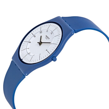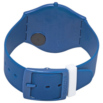 Blue plastic case with a blue silicone strap. Fixed blue plastic with a black ring bezel. White dial with black hands and Arabic numeral / index hour markers. Minute markers around the outer rim. Dial Type: Analog. Quartz movement. Plexiglass crystal. Pull / push crown. Solid case back. Round case shape. Case size: 34 mm. Case thickness: 3.90 mm. Band width: 17 mm. Band length: 8.25 inches. Tang clasp. Water resistant at 30 meters / 100 feet. Functions: hour, minute. Swatch Marmarella White Dial Ladies Watch SFN124.