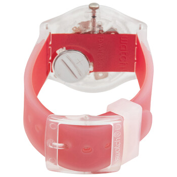Transparent plastic case with a transparent red silicone strap. Fixed transparent plastic bezel. Transparent dial with red, blue, yellow hands. Minute markers around the outer rim. Dial Type: Analog. Quartz movement. Scratch resistant plexiglass crystal. Pull / push crown. Transparent case back. Round case shape, case size: 34 mm, case thickness: 8.75 mm. Band width: 16 mm. Buckle clasp. Water resistant at 30 meters / 100 feet. Functions: hour, minute, second. Monthly Drops Series. Casual watch style. Watch label: Swiss Made. Swatch Monthly Drops Clearly Red Striped Quartz Unisex Watch GE292.