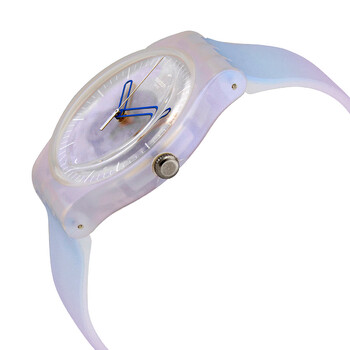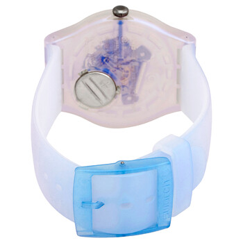 Blue plastic case with a blue silicone strap. Fixed blue plastic bezel. Blue (skeleton center) dial with blue skeleton hands and index hour markers. Minute markers around the outer rim. Dial Type: Analog. Quartz movement. Scratch resistant plexiglass crystal. Pull / push crown. Transparent case back. Round case shape. Case size: 41 mm. Case thickness: 10 mm. Band width: 19.7 mm. Tang clasp. Water resistant at 30 meters / 100 feet. Functions: hour, minute, second. Monthly Drops Flowerscreen Series. Casual watch style. Watch label: Swiss Made. Swatch Monthly Drops Flowerscreen Quartz Blue Skeleton Dial Ladies Watch SUOK154.