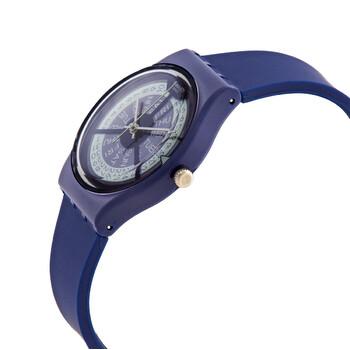 Blue plastic case with a blue silicone strap. Fixed blue plastic bezel. Blue dial with silver-tone and blue hands. Dial Type: Analog. Day of the week and date display at the 3 o'clock position. Quartz movement. Scratch resistant plexiglass crystal. Pull / push crown. Solid case back. Round case shape, case size: 34 mm, case thickness: 9 mm. Buckle clasp. Water resistant at 30 meters / 100 feet. Functions: date, day, hour, minute, second. Monthly Drops Series. Casual watch style. Swatch Monthly Drops Quartz Blue Dial Unisex Watch GN727.