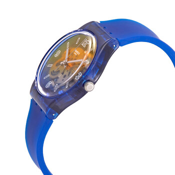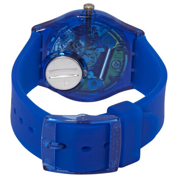 Blue (transparent) plastic case with a blue silicone strap. Fixed blue (transparent) plastic bezel. Transparent (skeleton) dial with silver-tone hands and index hour markers. Arabic numeral marker appears at the 3, 6, 9 and 12 o'clock positions. Dial Type: Analog. Quartz movement. Plexiglass crystal. Pull / push crown. Transparent case back. Round case shape. Case size: 34 mm. Case thickness: 8.75 mm. Tang clasp. Water resistant at 30 meters / 100 feet. Functions: hour, minute, second. Monthly Drops Series. Casual watch style. Swatch Monthly Drops Quartz Transparent Dial Unisex Watch GN278.