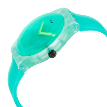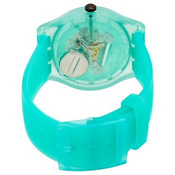 Green (translucent) plastic case with a mint green silicone strap. Fixed green (translucent) plastic bezel. Green translucent dial with neon yellow hands. No markers. Dial Type: Analog. Quartz movement. Plexiglass crystal. Pull / push crown. Translucent case back. Round case shape. Case size: 41 mm. Case thickness: 9.85 mm. Band width: 20 mm. Tang clasp. Water resistant at 30 meters / 100 feet. Functions: hour, minute. Nature Blur Series. Casual watch style. Watch label: Swiss Made. Swatch Nature Blur Quartz Green Translucent Dial Men's Watch SUOG119.