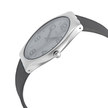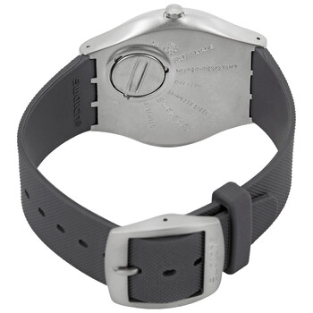 Grey-plated stainless steel case with a grey rubber strap. Fixed grey-plated bezel. Grey dial with silver-tone hands and alternating index and Arabic numerals hour markers. Dial Type: Analog. Quartz movement. Plexiglass crystal. Pull / push crown. Solid case back. Round case shape. Case size: 42 mm. Case thickness: 6.70 mm. Band width: 18 mm. Tang clasp. Water resistant at 30 meters / 100 feet. Functions: hour, minute. Night Trick Series. Casual watch style. Swatch Night Trick Quartz Grey Dial Men's Watch SS07S110.