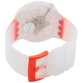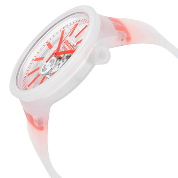 White (translucent) plastic case with a white silicone strap. Fixed white (translucent) plastic bezel. White (skeleton center) dial with orange hands and index hour markers. Dial Type: Analog. Quartz movement. Plexiglass crystal. Pull / push crown. Solid case back. Round case shape. Case dimensions: 47 mm x 44 mm. Case thickness: 11.75 mm. Band width: 19.7 mm. Orange aluminium tang clasp. Water resistant at 30 meters / 100 feet. Functions: hour, minute, second. Black-in-jelly Series. Casual watch style. Swatch Orange-In-Jelly Quartz White Skeleton Center Watch SO27E102