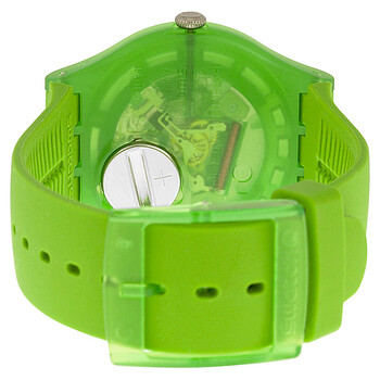 Green plastic case with a green silicone strap. Fixed green plastic bezel. Green dial with skeleton display and green hands. No markers. Dial Type: Analog. Quartz movement. Plastic crystal. Push/pull crown. Transparent case back. Case diameter: 42 mm. Case thickness: 10 mm. Round case shape. Tang clasp. Water resistant at 30 meters / 100 feet. Functions: hour, minutes, seconds. Casual watch style. Watch label: Swiss Made. Swatch Originals Green Lacquered Green Silicone Men's Watch SUOG103.