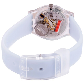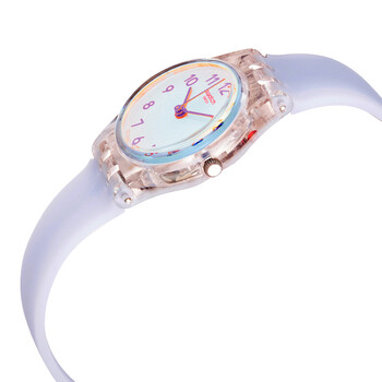 Transparent plastic case with a blue silicone strap. Fixed plastic bezel. Blue dial with purple hands and Arabic numeral hour markers. Dial Type: Analog. Quartz movement. Plexiglass crystal. Pull / push crown. Solid case back. Round case shape. Case size: 25 mm. Case thickness: 8.4 mm. Band width: 12 mm. Buckle clasp. Water resistant at 30 meters / 100 feet. Functions: hour, minute, second. Casual watch style. Swatch Originals Quartz Blue Dial Ladies Watch LK396.