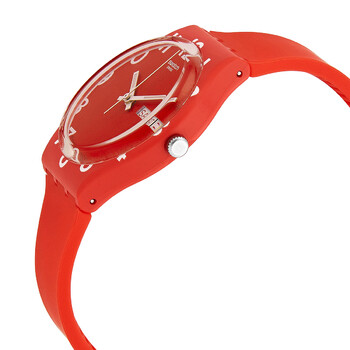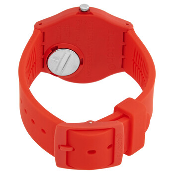 Red plastic case with a red silicone strap. Fixed red plastic bezel. Red dial with silver-tone hands and Arabic numeral hour markers. Dial Type: Analog. Day of the week and date display at the 3 o'clock position. Quartz movement. Plexiglass crystal. Pull / push crown. Solid case back. Round case shape. Case size: 34 mm. Case thickness: 8.75 mm. Band width: 16 mm. Tang clasp. Water resistant at 30 meters / 100 feet. Functions: date, day, hour, minute, second. Over Red Series. Casual watch style. Swatch Over Red Quartz Red Dial Red Silicone Unisex Watch GR713.