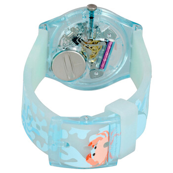 Transparent plastic case with a blue silicone strap. Fixed transparent plastic bezel. Transparent dial with gold-tone hands. Dial Type: Analog. Quartz movement. Pull / push crown. Case size: 34 mm. Case thickness: 8.75 mm. Round case shape. Tang clasp. Water resistant at 30 meters / 100 feet. Functions: hour, minute, second. Casual watch style. Swatch Piscina Transparent Dial Ladies Watch GL121.