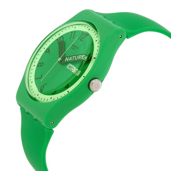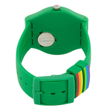 Green bio-sourced case with a green silicone strap. Fixed green bio-sourced bezel. Green dial with black hands and Arabic numeral hour markers. Minute markers around the outer rim. Dial Type: Analog. Day of the week and date display at the 3 o'clock position. Quartz movement. Scratch resistant acrylic crystal. Pull / push crown. Solid case back. Round case shape, case size: 41 mm, case thickness: 9.85 mm. Buckle clasp. Water resistant at 30 meters / 100 feet. Functions: date, day, hour, minute, second. Pride Series. Casual watch style. Watch label: Swiss Made. Swatch Pride Quartz Green Dial Unisex Watch SO29G704.