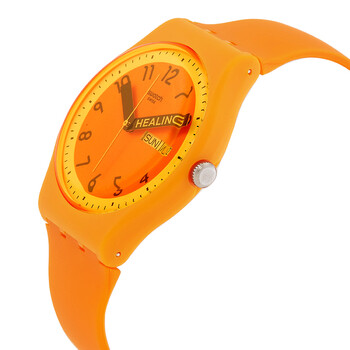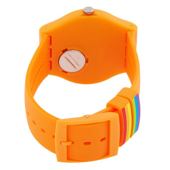 Orange bio-sourced case with a orange silicone strap. Fixed orange bio-sourced bezel. Orange dial with black hands and Arabic numeral hour markers. Minute markers around the outer rim. Dial Type: Analog. Day of the week and date display at the 3 o'clock position. Quartz movement. Scratch resistant acrylic crystal. Solid case back. Round case shape, case size: 41 mm, case thickness: 10 mm. Buckle clasp. Water resistant at 30 meters / 100 feet. Functions: date, day, hour, minute, second. Pride Series. Casual watch style. Watch label: Swiss Made. Swatch Pride Quartz Orange Dial Unisex Watch SO29O700.