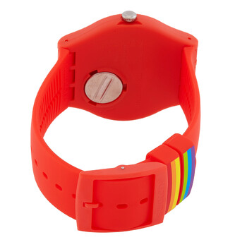 Red bio-sourced case with a red silicone strap. Fixed red bio-sourced bezel. Red dial with black hands and Arabic numeral hour markers. Minute markers around the outer rim. Dial Type: Analog. Day of the week and date display at the 3 o'clock position. Quartz movement. Scratch resistant acrylic crystal. Pull / push crown. Solid case back. Round case shape, case size: 41 mm, case thickness: 9.85 mm. Buckle clasp. Water resistant at 30 meters / 100 feet. Functions: date, day, hour, minute, second. Pride Series. Casual watch style. Watch label: Swiss Made. Swatch Pride Quartz Red Dial Unisex Watch SO29R705.