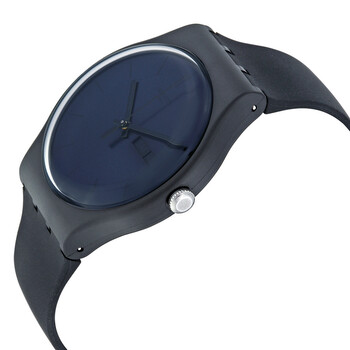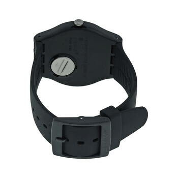 Black plastic case with a black rubber strap. Fixed black plastic bezel. Black dial with black steel hands and index hour markers. Dial Type: Analog. Day and date display at the 3 o'clock position. Quartz movement. Plexiglass crystal. Pull / push crown. Solid case back. Round case shape. Case size: 41 mm. Case thickness: 11 mm. Band width: 22 mm. Tang clasp. Water resistant at 30 meters / 100 feet. Functions: hours, minutes, seconds, calendar. Casual watch style. Swatch Rebel Black Dial Men's Watch SUOB702.